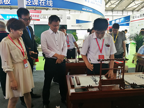教育部關(guān)心下一代工作委員會常務副主任、中國教育裝備行業(yè)協(xié)會會長王富蒞臨展位,體驗智慧書法教室并給出高度評價。