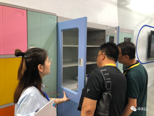▲工作人員向觀眾介紹ABS書包柜
