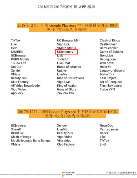 眾所周知,近年來印度市場已成為中國App紛紛選擇出海的第一站。截至2018年年底, 印度Google Play Store移動應用Top 100(涵蓋不同分類)的App中,中國App就占了44個,U-Dictionary便是其中一款。在登陸印度市場僅數月內,U-Dictionary即在“Best Self-Improvement”細分榜單中名列第一,超過了在全球備受歡迎的TED與語言學習工具Duolingo(多鄰國),同時也領先印度本土的學習App:BYJU'S。