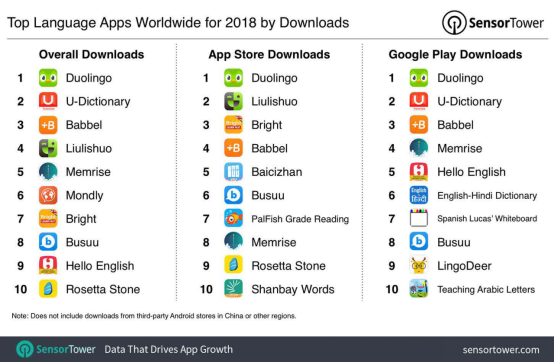另外,SensorTower數據還顯示,2018年全球語言類App下載量榜單排名,U-Dictionary在下載量總榜與Google Play下載量排行榜上均排名第二,僅次于老牌產品Duolingo。