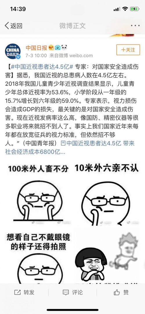 2018年8月,教育部、國家衛生健康委員會等8部門聯合印發《綜合防控兒童青少年近視實施方案》,提出了到2030年中國6歲兒童近視率控制在3%左右的目標。近視防治成了一個全民關注的話題。