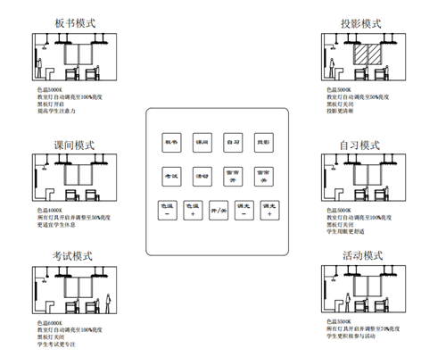 星奧LED護眼燈具智能控制系統優勢顯著:同時預設板書、課間、投影、自習、活動、考試六種模式,觸摸屏開關一鍵控制,實現燈具與電動窗簾智能物聯,提高教學光環境自適應能力。