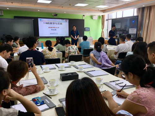 培訓第二天,希沃邀請到云南師范大學的朱云東教授,為此次參與研修班的老師開展題為“此題目為《1+N的教學與實踐》的專題講座。朱教授結合自身教育教學經歷,暢談信息化的必要性和深化發展,感慨教育信息化進一步促進教學均衡發展,因此堅定不移推廣1+N教學模式。利用人工智能+教育,實現一校帶多校共通發展,其中數據分析、專家指導、加強教師信息化能力尤為重要,主講教師和助教教師協同合作,進一步融合教學。