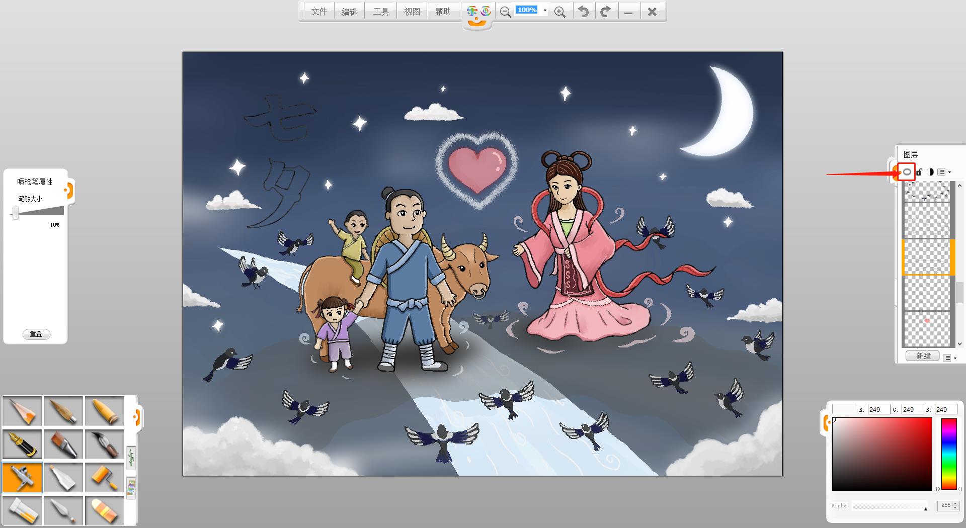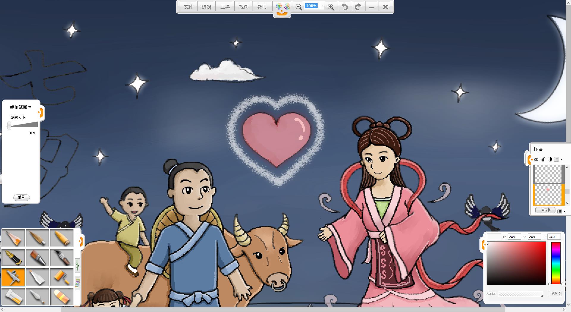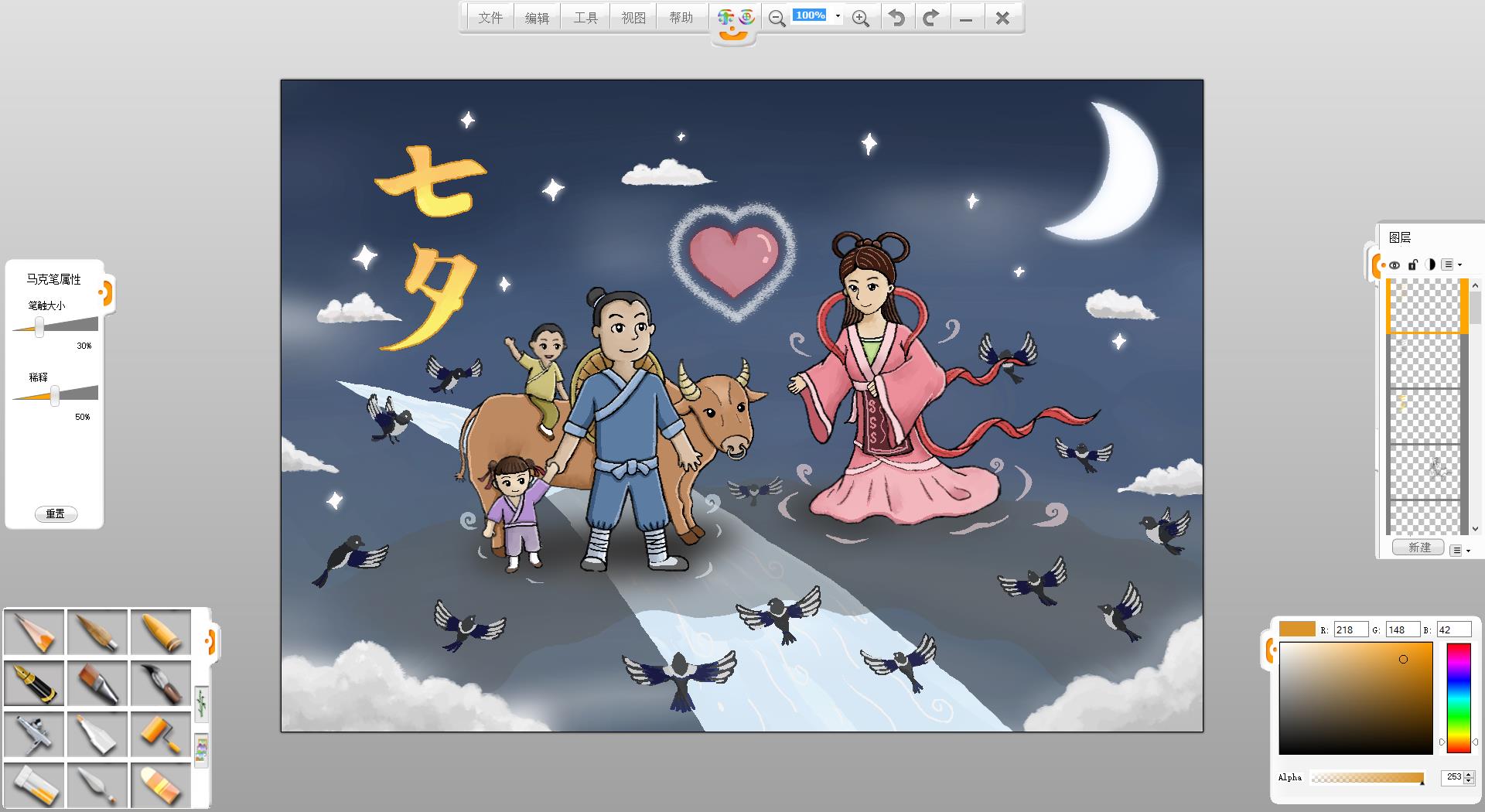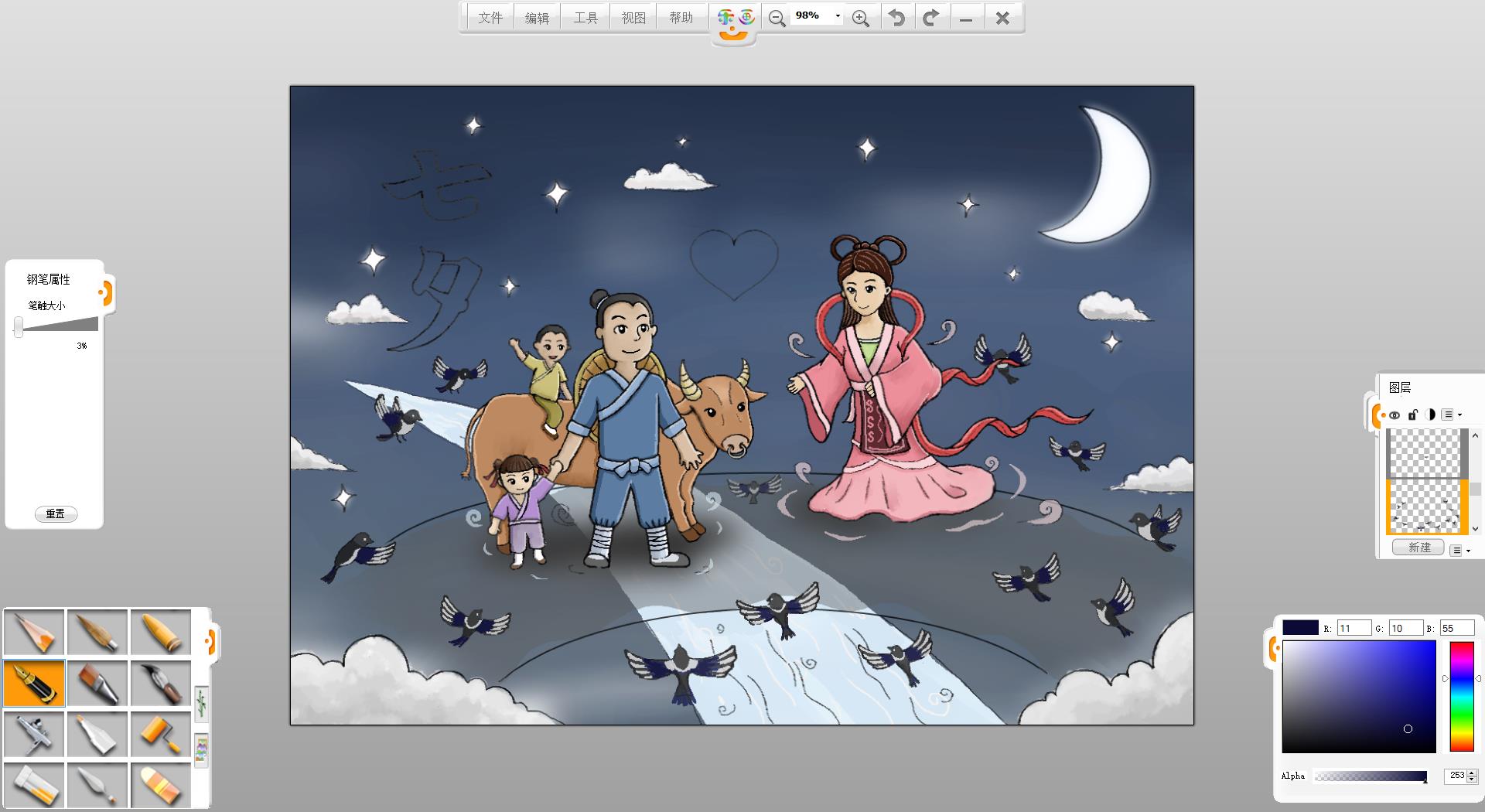 9.使用鉛筆筆觸在畫面左上方書寫“七夕”兩個字。