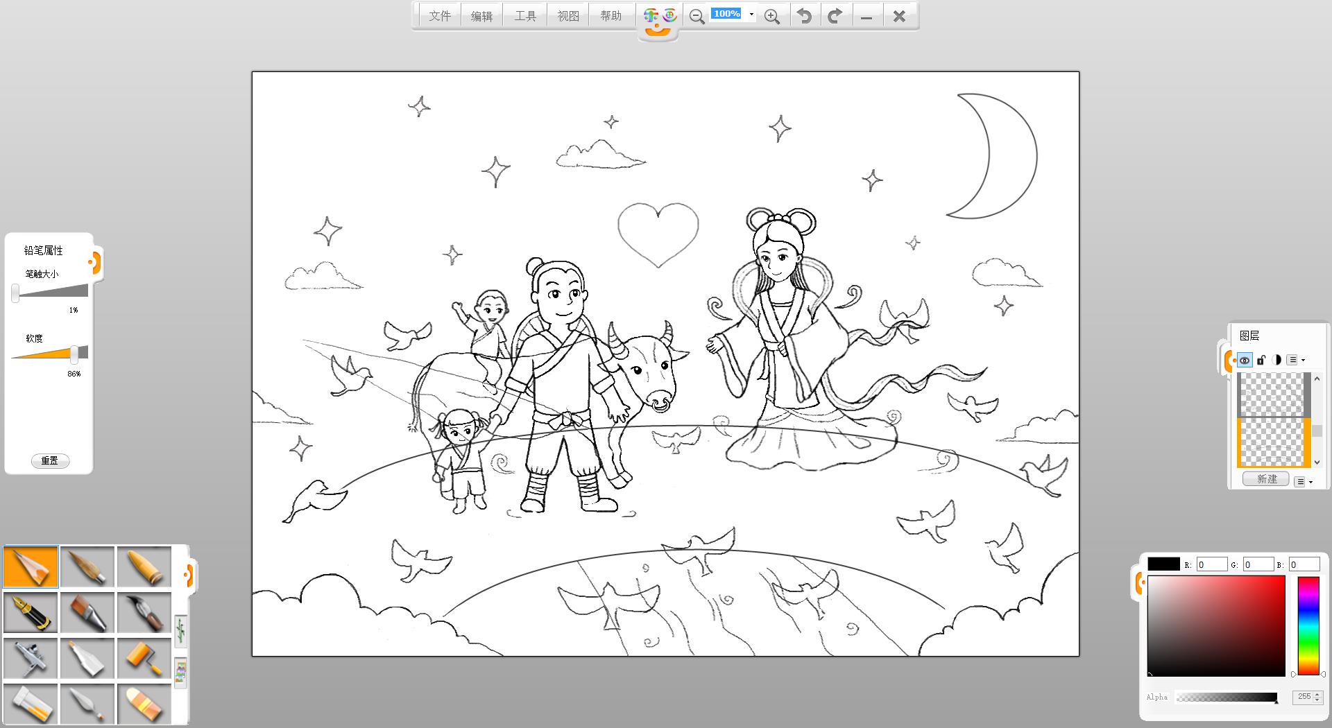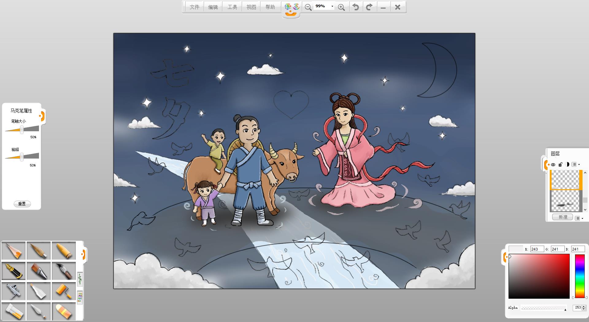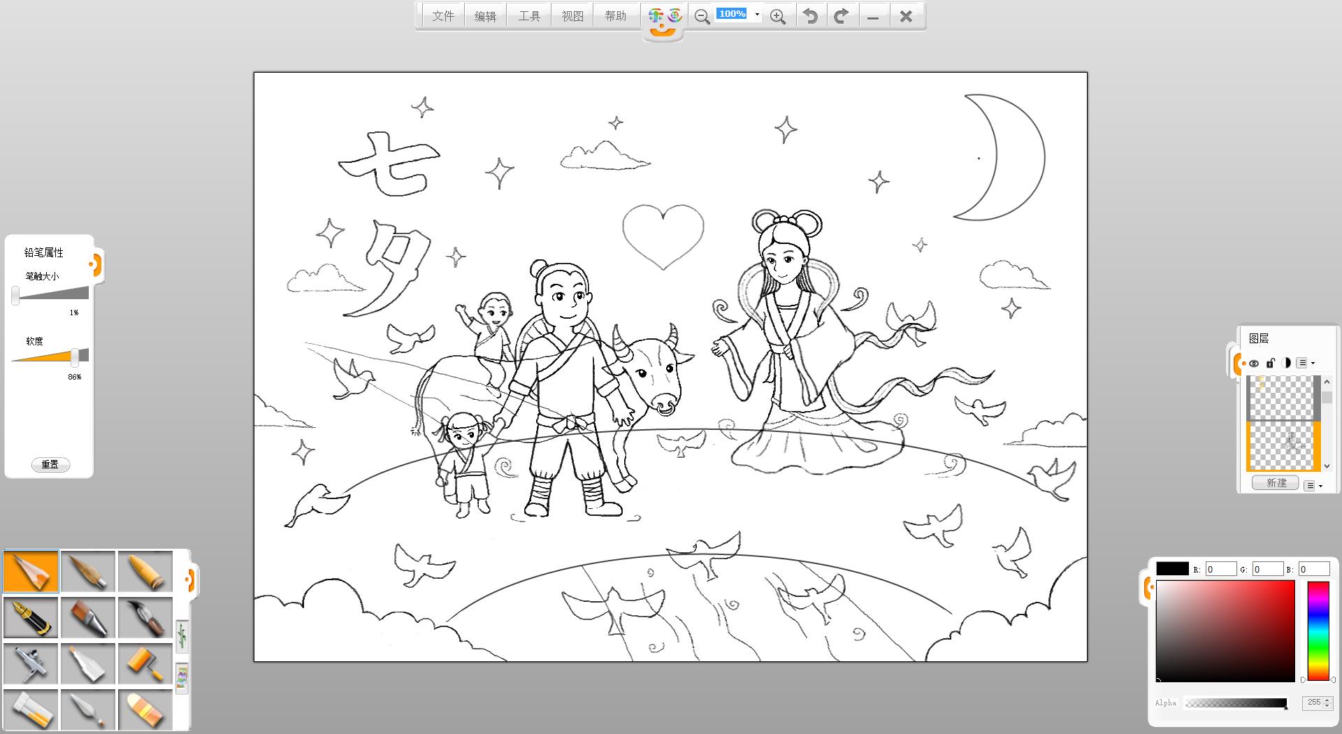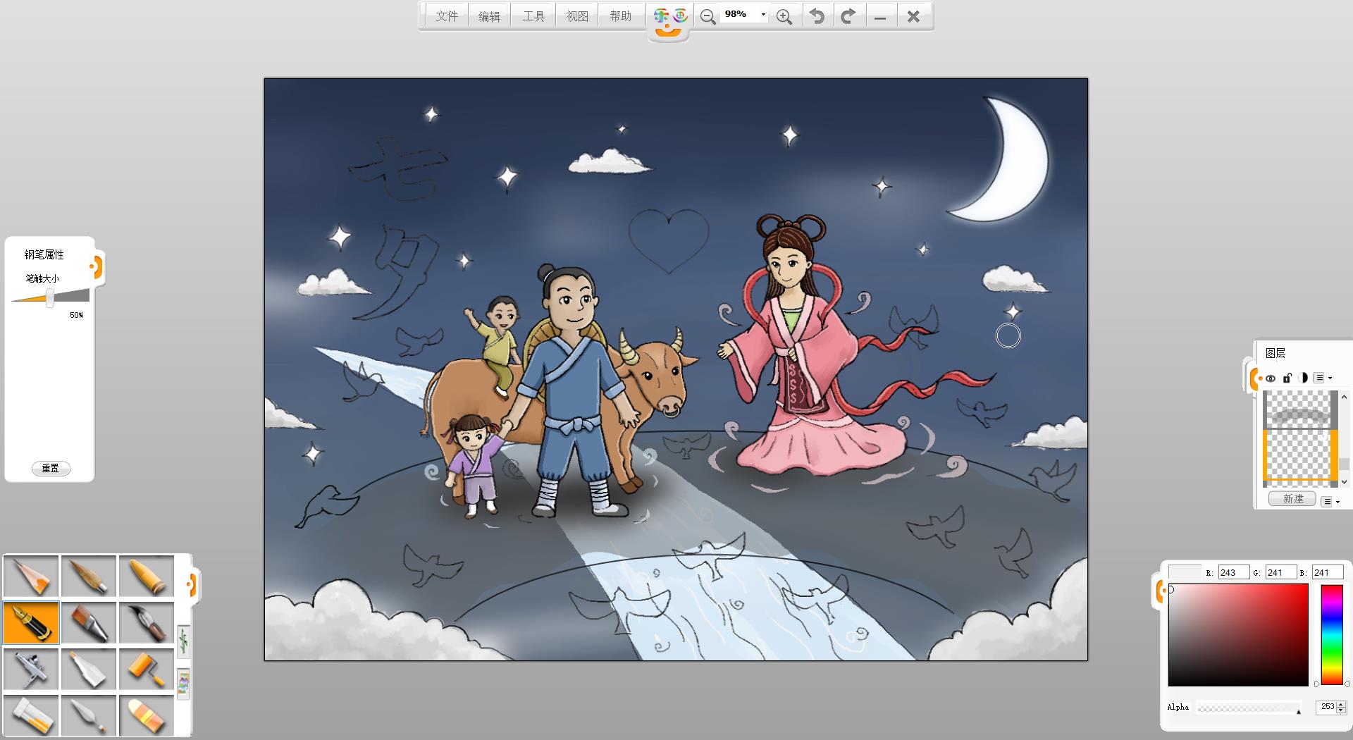 9.使用鉛筆筆觸在畫面左上方書寫“七夕”兩個字。