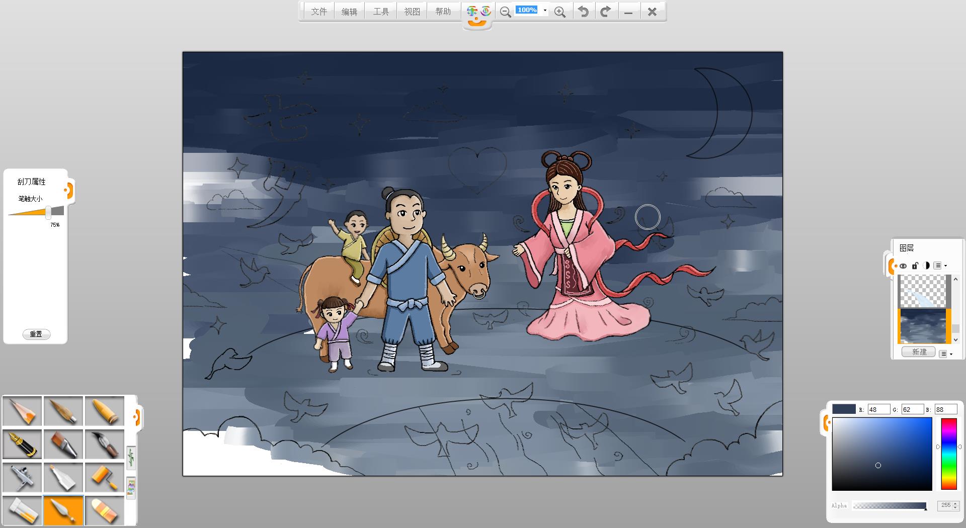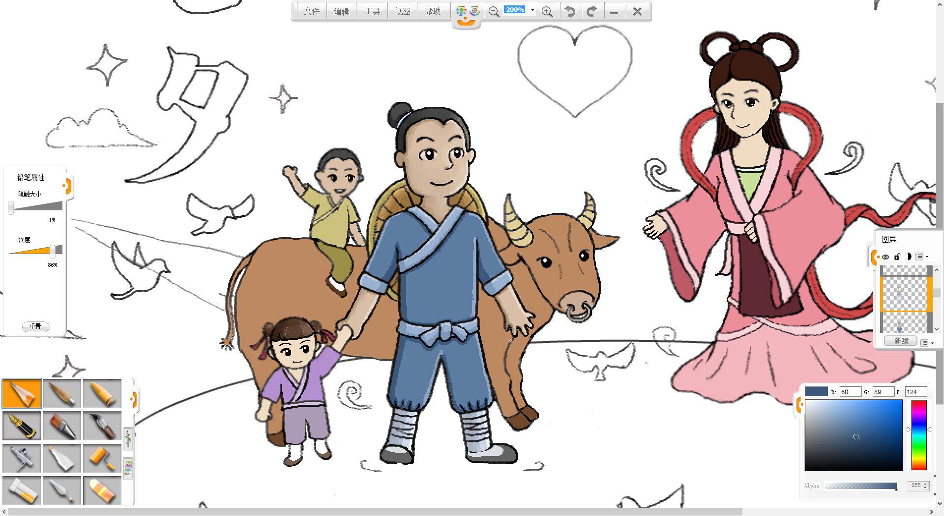 4.在畫面左側使用鉛筆筆觸繪制一個牽著女兒的牛郎形象。