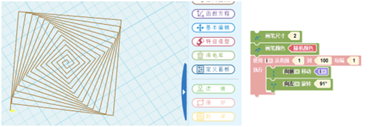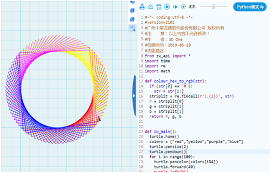 3D One軟件積木模式下,只需通過海龜庫控制畫筆的移動,并結合數學知識,簡單幾步操作,就能繪制出形狀和顏色都鮮艷豐富的圖案,單擊切換Python模式還可了解圖案代碼,為少兒入門學習Python提供更加輕松樂趣的途徑。