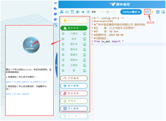3D One軟件語法面板庫里集合了Python編程所有涉及到的語法語句、建模API、海龜庫命令等,并支持對插入的語句在線進行指引,幫助掌握代碼意思和用法。