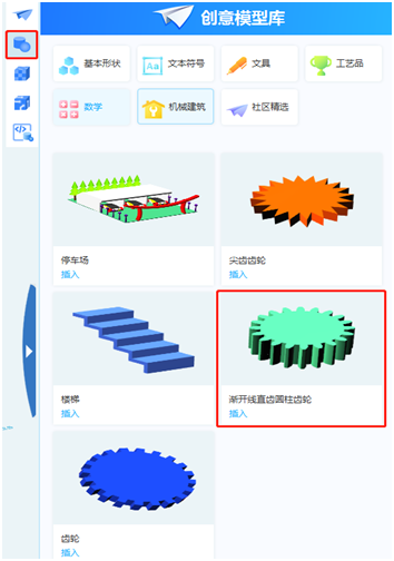 3D One V2.6版本創意模型庫新增漸開線直齒圓柱齒輪,一鍵生成適用于各種場景的不同大小齒輪,幫助老師同學輕松構建各種聯動結構,堆疊出自己的創意模型。