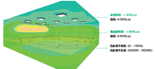 全LED光源“9+2”或“9+3”模式: 9個教室燈,2~3個黑板燈,配合不同的教學場景,匹配不同的亮度及色溫,提高學習效率。
