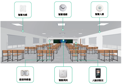 同時,通過智慧光感、智慧人感,感知環境情況,自動調節設備運行狀態,以達到節能目的;而智慧煙感通過監測煙霧的濃度來實現火災防范;人臉識別儀自動識別身份,聯動教學,高效快捷。
