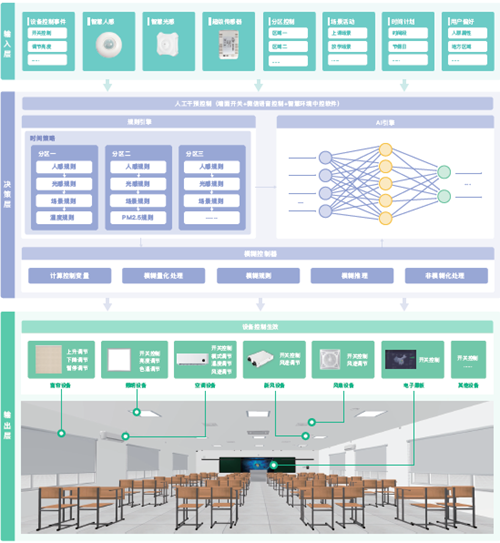 智慧節能系統綜合可以分析設備控制事件、智慧人感、智慧光感等輸入參數,運用規則引擎、模糊控制和人工智能算法,對照明、空調、風扇、新風、電子黑板等各類設備的工作狀態進行集成管控,實現最佳節能效果,僅照明管控一項就能實現高達40%的節能效果*。