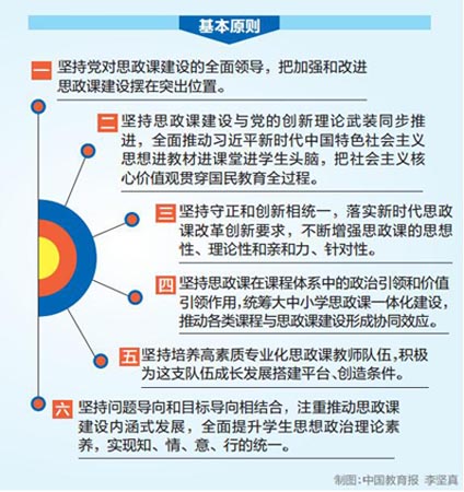 3.基本原則。一是堅持黨對思政課建設的全面領導,把加強和改進思政課建設擺在突出位置。二是堅持思政課建設與黨的創新理論武裝同步推進,全面推動習近平新時代中國特色社會主義思想進教材進課堂進學生頭腦,把社會主義核心價值觀貫穿國民教育全過程。三是堅持守正和創新相統一,落實新時代思政課改革創新要求,不斷增強思政課的思想性、理論性和親和力、針對性。四是堅持思政課在課程體系中的政治引領和價值引領作用,統籌大中小學思政課一體化建設,推動各類課程與思政課建設形成協同效應。五是堅持培養高素質專業化思政課教師隊伍,積極為這支隊伍成長發展搭建平臺、創造條件。六是堅持問題導向和目標導向相結合,注重推動思政課建設內涵式發展,全面提升學生思想政治理論素養,實現知、情、意、行的統一。