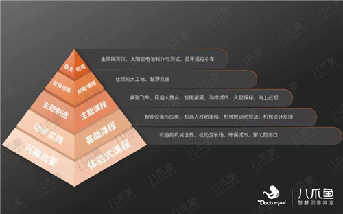 八爪魚的課程體系是遞進式的課程結構,針對不同年齡段的學生,配備不同難易程度的課程,按照學生的創客基礎、能力、年齡等方面進行選擇和匹配。 如初級的體驗式課程,更多側重于興趣的啟蒙,基礎課程則更考驗學生的動手實踐能力,主題課程是在學生已經具備主題思路的情況下進行創造,到創新課程和自主創造,就需要學生大膽創新,在課程基礎上加入自己的創造性想法。