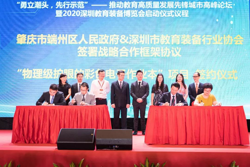 簽約儀式上,在肇慶市端州區(qū)區(qū)委書記劉慶良,肇慶市端州區(qū)區(qū)委常委、常務(wù)副區(qū)長(zhǎng)李健暉,肇慶市端州區(qū)區(qū)政協(xié)副主席李沁,肇慶市端州區(qū)區(qū)政協(xié)副主席、區(qū)教育局局長(zhǎng)吳秀枝,深圳市教育局局長(zhǎng)助理、心里程控股集團(tuán)董事長(zhǎng)彭國(guó)遠(yuǎn),深圳市教育裝備行業(yè)協(xié)會(huì)理事長(zhǎng)朱景鵬,深圳市教育裝備行業(yè)協(xié)會(huì)秘書長(zhǎng)羅帝清,深圳市教育裝備行業(yè)協(xié)會(huì)常務(wù)副秘書長(zhǎng)文熠等領(lǐng)導(dǎo)的共同見證下,深圳市教育裝備行業(yè)協(xié)會(huì)會(huì)長(zhǎng)彭錦環(huán)與肇慶市端州區(qū)副區(qū)長(zhǎng)黎曉簽署了戰(zhàn)略合作框架協(xié)議,協(xié)會(huì)常務(wù)副會(huì)長(zhǎng)單位深圳市前海前沿科技產(chǎn)業(yè)管理有限公司總經(jīng)理吳政銘與深圳市前海謙潤(rùn)資產(chǎn)管理有限公司首席運(yùn)營(yíng)官劉小兵簽署了“物理級(jí)護(hù)眼的彩色電子作業(yè)本”項(xiàng)目協(xié)議。