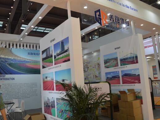 深圳善跑攜塑膠跑道材料、丙烯酸球場材料及硅PU球場材料、人造草坪等產品亮相。