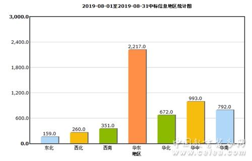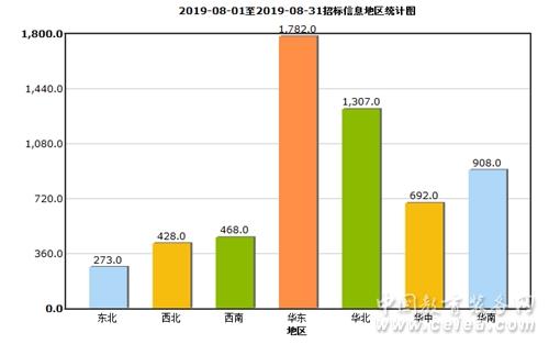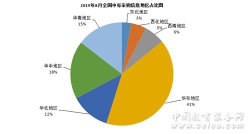 從8月中標信息地區(qū)統(tǒng)計圖(如圖8所示)和全國中標信息地區(qū)占比圖(如圖9所示)來看:華東地區(qū)中標信息量為2217條,占比41%;華中地區(qū)中標信息量為993條,占比18%;華南地區(qū)中標信息量為792條,占比15%;華北地區(qū)中標信息量為672條,占比12%;西南地區(qū)招中標信息量為351條,占比6%;西北地區(qū)中標信息量為260條,占比5%;東北地區(qū)中標信息量為159條,占比3%。