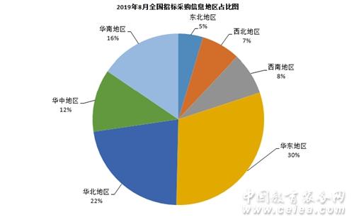 從8月招標采購信息地區(qū)統(tǒng)計圖(如圖3所示)和全國招標采購信息量地區(qū)占比圖(如圖4所示)可以看出:華東地區(qū)招標采購信息量為1782條,占比30%;華北地區(qū)招標采購信息量為1307條,占比22%;華南地區(qū)招標信息采購量為908條,占比16%;華中地區(qū)招標采購信息量為692條,占比12%;西南地區(qū)招標采購信息量為468條,占比8%;西北地區(qū)招標采購信息量為428條,占比7%;東北地區(qū)招標采購信息量為273條,占比5%。