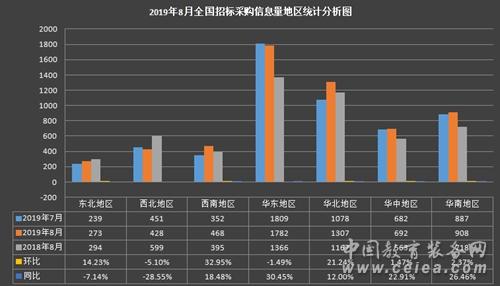 綜合8月全國招標采購信息量地區(qū)統(tǒng)計分析圖(如圖5所示):西北地區(qū)環(huán)比下降5.10%,同比下降28.55%;華東地區(qū)環(huán)比下降1.49%,同比增長30.45%;華南地區(qū)環(huán)比增長2.37%,同比增長26.46%;華北地區(qū)環(huán)比增長21.24%,同比增長12.00%;華中地區(qū)環(huán)比增長1.47%,同比增長22.91%;東北地區(qū)環(huán)比增長14.23%,同比下降7.14%;西南地區(qū)環(huán)比增長32.95%,同比增長18.48%。