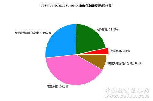 8月份招標采購信息所屬領(lǐng)域統(tǒng)計情況如圖6所示:學前教育占比為3.6%;義務(wù)教育占比為21.2%;高中階段教育(含職教)占比為26.9%;高等教育占比為40.1%;其他教育(含特殊教育)占比為8.3%。