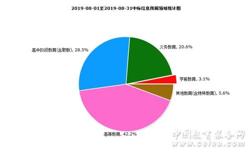 8月中標信息所屬領(lǐng)域統(tǒng)計圖,如圖10所示:學前教育占比為3.1%;義務(wù)教育占比為20.6%;高中階段教育(含職教)占比為28.5%;高等教育占比為42.2%;其他教育(含特殊教育)占比為5.6%。