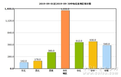 綜合9月全國招標采購信息量地區統計分析圖(如圖5所示):西北地區環比下降10.98%,同比增長41.11%;華東地區環比下降24.75%,同比增長42.06%;華南地區環比下降16.30%,同比增長105.96%;華北地區環比下降32.75%,同比增長27.02%;華中地區環比下降34.39%,同比增長19.79%;東北地區環比下降29.30%,同比下降6.76%;西南地區環比下降11.11%,同比增長109.05%。