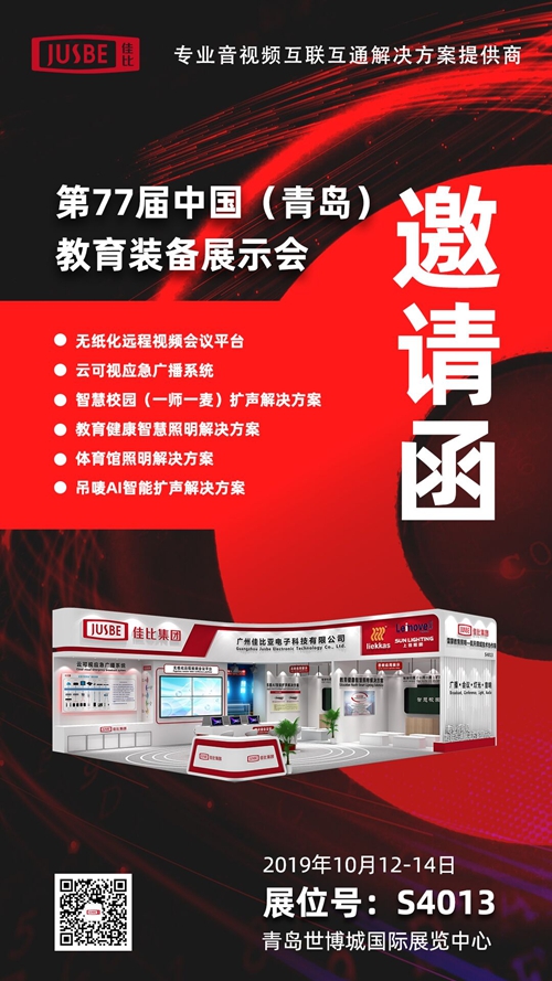 金秋十月,第77屆中國教育裝備展示會于2019年10月12日-14日在青島世博城國際展覽中心盛大舉行。佳比在 S4013 展位 誠邀全國各地教育專家、技術精英及廣大客戶朋友們蒞臨青島盛會!