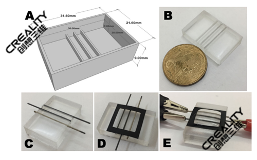 電化學平臺的制造步驟:(A)用于PDMS設備原型的3D打印模具的CAD設計。內部浮雕結構為長20 mm×寬600μm×高1 mm; (B)使用3D打印機模具獲得的PDMS裝置;(C)具有集成工作電極,偽參比電極和對電極的PDMS微型電池; (D)用膠帶定界的電極的幾何面積,以及(E)電化學平臺