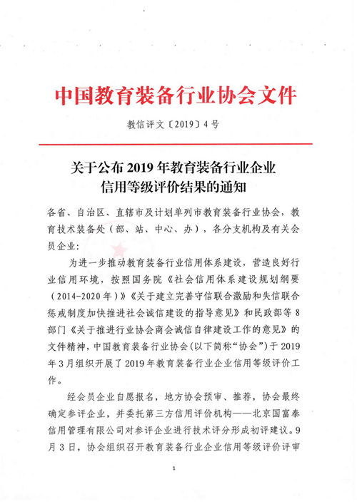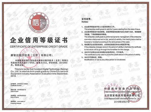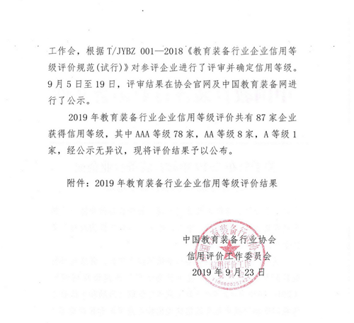 康智達公司榮獲中國教育裝備行業(yè)協(xié)會企業(yè)信用等級評價AAA級證書