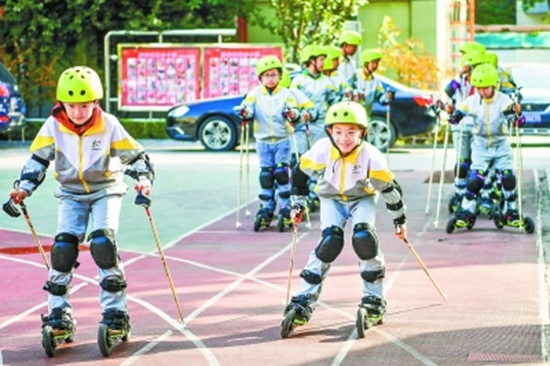 和平里四小的模擬冬奧會共設置了3個競技類項目,分別是旱地冰球、旱地冰壺和越野滑輪。“學校設立了專門的旱地冰球隊,每年冬天不同年級的學生會輪流去鳥巢體驗冰雪運動。我們的目標是讓每個孩子在小學期間掌握一項冰雪運動。”該校體育教研組長田玉杰介紹,這場“冬奧會”前,冰雪項目旱地化專業教練團隊專門走進了校園,對各個項目進行訓練指導及比賽規程宣貫,指導學生正確并安全使用各項冰雪旱地化項目器材,熟悉項目規則,掌握基本技巧。