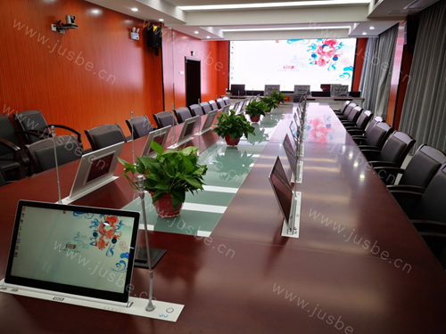 會(huì)議室桌面采用的是自帶話筒升降的雙顯升降式觸摸屏,開(kāi)會(huì)時(shí),參會(huì)者只需觸控屏幕即可輕松進(jìn)行資料查閱、批注、同屏投影、視頻服務(wù)、交互電子白板等會(huì)議服務(wù),極大提升會(huì)議溝通效率,會(huì)議流程更加靈活、順暢。會(huì)后管理員對(duì)文件自定義加密的設(shè)置,增強(qiáng)重要資料的安全保密性,防止泄露。