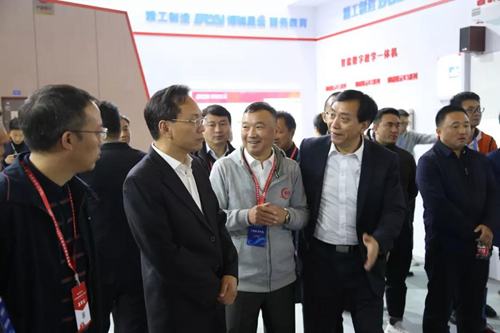 四川博瑞星云信息技術有限公司董事長王建華(右二)向蒞臨博瑞星云展位的四川省委教育工委書記、省教育廳黨組書記、廳長李江(左二)、四川省教育廳技術物資管理指導中心主任劉漢濤(右一)進行參展智慧校園建設方案匯報。