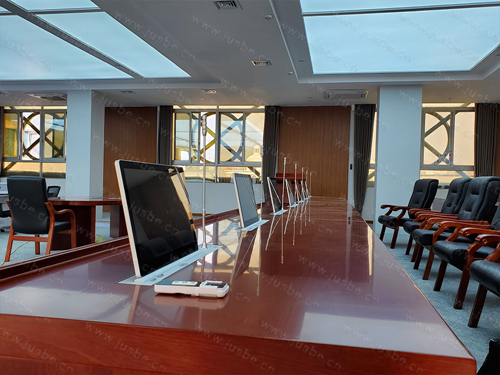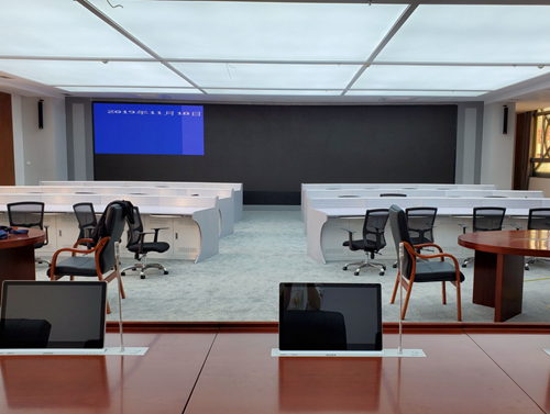 根據客戶需求及場地布局結構,在指揮席位區,配置了多套無紙化升降器,嵌入式安裝方式,使得桌面整潔美觀。無紙化屏幕界面采用1080P高清屏,可進行手控、遙控、中控三種方式升降、開關機控制。同時,配套的數字會議討論話筒單元(帶升降),采用超心型指向的電容話筒,高品質聲音拾取,可配合高清攝像機,連接視頻會議系統實現自動實時發言跟蹤功能。