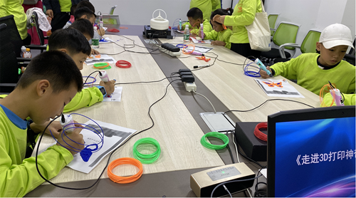 接下來的環(huán)節(jié)中,李老師帶領(lǐng)學(xué)生們進行3D打印筆的教學(xué)。通過幾分鐘的介紹,學(xué)生們就能快速上手操作3D打印筆進行繪畫了。小編不得不感嘆學(xué)生們的動手能力真強,能夠又快又好地完成作品。