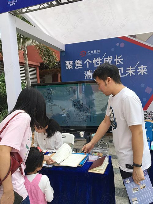 “我可以試試嗎?”參與創(chuàng)客節(jié)競(jìng)賽的學(xué)生拿起電子筆,帶著興奮與期待咨詢(xún)展位上的工作人員。在光大教育的展位前圍著不少的學(xué)生、老師、家長(zhǎng),不少人興致勃勃地在紙上寫(xiě)寫(xiě)畫(huà)畫(huà),筆跡同步呈現(xiàn)在電子屏上,引起他們的驚嘆與好奇。