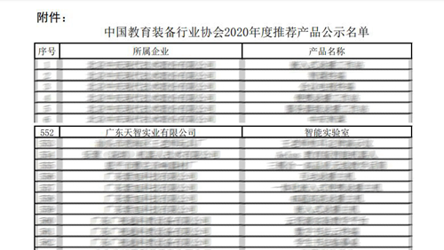 近幾天,中國教育裝備行業協會公示了2020年度推薦產品名單,天智實業智能實驗室成功入選推薦產品名單。