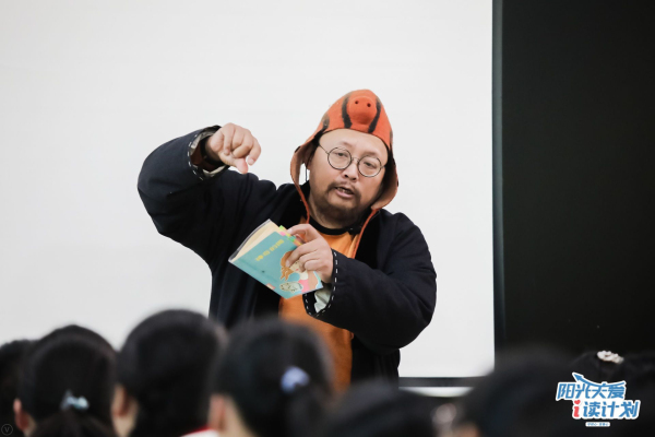 課上,他前后戴上三頂款式各異的帽子--標志性紅尖、橘色豬腦袋、黃色皮卡丘,熱情地在閱讀室里走上走下,為孩子們分享人生中他自己掏錢買的第一本書《夏洛的網》。