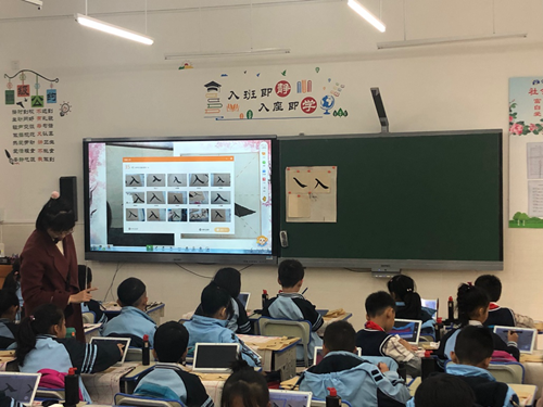 上午9點,家長們陸續來到學校走進課堂。此次開放日,學校特意安排了多門不同課程供家長觀摩。除了語文、數學、英語等基礎學科之外,還有書法、音樂等藝術學科以及親子互動課。老師們各展身手,學生們興趣盎然。書法課上,老師細致地講解“入”字筆畫書寫,同時讓學生各自進行練習并使用希沃學生平板對自己的書法作品進行拍照上傳,所有同學和老師都能夠及時看到彼此的學習結果。通過對比,老師再進一步講解,糾正落筆細節錯誤。在場的家長驚喜地表示,沒想到書法課還能和信息技術融合得這么好,不僅可以及時把孩子的學習情況直觀呈現出來,還能夠借此及時反饋孩子的學習情況。“如果以前自己上學的時候就有希沃易課堂就好了。”