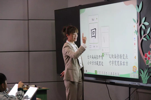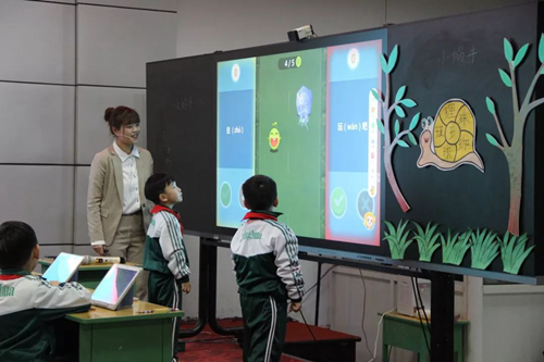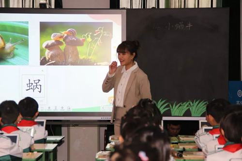 首先展示課堂的是英華完全小學一年級七班的王璐娜老師,她講授的是部編版一年級語文課《小蝸牛》。正式上課前,同學們齊唱一首動聽的兒歌《蝸牛與黃鸝鳥》,在歌聲中放松心情,更好地進入課堂。老師通過希沃易課堂的搶答及抽選功能活躍課堂氛圍,之后運用課件推送功能,讓全體同學在希沃平板上完成連線題,同學們學會了根據漢字偏旁猜測詞語含義,老師在大屏幕展示答案,并為答對的同學們加分。課程中,緊張刺激的“賽跑”游戲更是讓課堂氛圍變得歡樂活潑,通過游戲形式判斷生詞讀音對錯,新知識也不知不覺印在了學生們的腦海。在學寫生字時,老師走到學生身邊拍攝標準寫字姿勢,并展示在屏幕上,提示一年級的孩子規范姿勢。