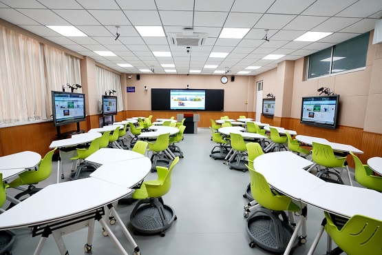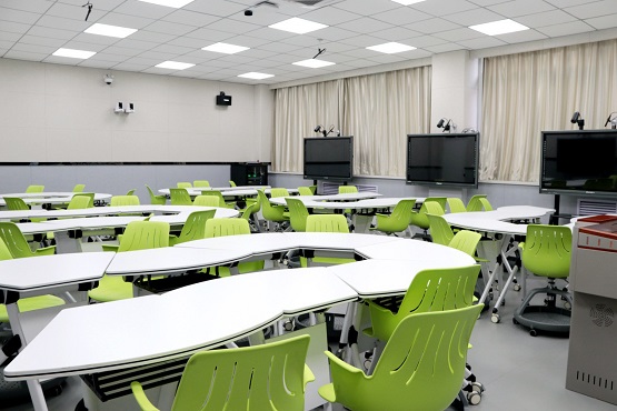 智慧教室分組布局靈活多變,師生們可以根據課堂教學環節的需要進行自由組合。在分組教學過程中,學生可以通過手機等智能設備,連接到課堂中參與小組討論,學生手中的“小屏”、每個小組設置的“中屏”以及教室前方的大屏之間可以進行輕松投屏互動。