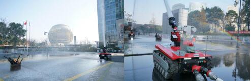 此外,大華智能消防機器人還在現場進行了滅火演練作業。在彩虹的映襯下,消防機器人成功撲滅了演練時點燃的火焰。