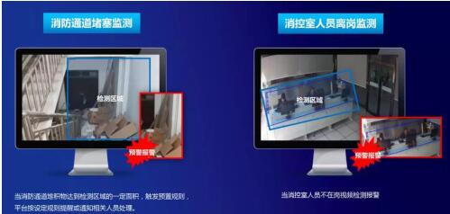 適用于銀行大樓和網點,加裝AI智能分析攝像頭,自動識別現場環境溫度、火災火點、消防通道堵塞及消防控制室人員值班脫崗情況。