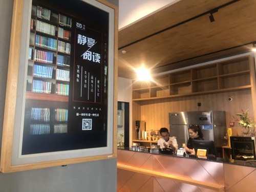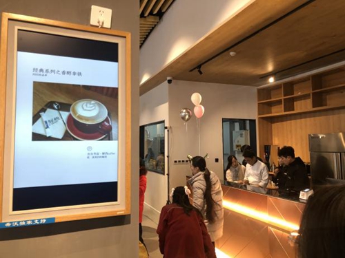 二層不僅有圖書還有咖啡、甜品等小食,旁邊懸掛一塊希沃云屏,讀者在看書的同時,還可以在希沃云屏上選上一杯喜歡的飲品,讓身心得到極大的放松。在緩慢而愜意的節奏、書香與咖啡香縈繞的書店里,希沃云屏幕通過輕松便捷的操作,賦予閱讀生活品質體驗。