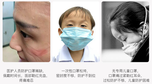 沖鋒在一線的醫(yī)務(wù)工作者、警務(wù)人員、志愿者等在與時(shí)間賽跑、疫情抗?fàn)幫瑫r(shí),他們需要長時(shí)間佩戴口罩。由于鼻梁顴骨和耳部等部位皮膚真皮層較薄,而且每個(gè)人的腦袋大小不一,長時(shí)間佩戴口罩不僅在臉上和耳后產(chǎn)生了深深的勒痕,充血,甚至出現(xiàn)傷口。