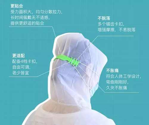 用TPU制成的口罩扣既能保證口罩佩戴過程中的強(qiáng)度要求,又能柔軟地貼合頭部表面,不產(chǎn)生勒痕,安全環(huán)保,對(duì)人體沒有毒副作用。由于是熱塑性塑料,支持除高溫高壓以外的所有消毒方式,消毒之后可以再利用。