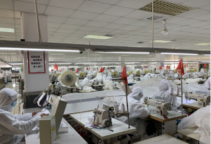 目標確立后,威達公司一邊緊急調整生產線、采購防護布和醫用無紡布,一邊對接當地市場監管局辦理相關生產資質。在區市場監管局的大力支持下,2月11日威達公司提交完整的產品備案材料后,一小時內就拿到了產品資質認證,次日清晨拿到了生產許可證(見圖2)威達公司所在地的環秀街道辦事處得知此事后,也為公司復工生產抗疫物資提供了積極的幫助。目前,威達公司正開足馬力、加班加點(見圖3),為一線醫務人員生產隔離服。
