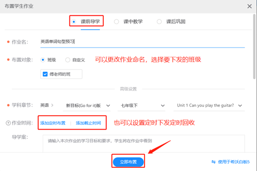 編輯好題目布置給學生即可,可以定時下發回收,提升學生的重視度。