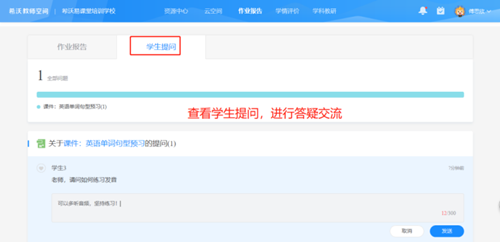 查看作業報告時,各位老師可以留意觀察學生查看資源的用時和時段,從而判斷其是否認真學習單詞卡,并且了解學習習慣,如果在深夜學習的學生,可以提醒他早點完成預習,不要熬夜學習,養成早睡的好習慣,讓老師與同學之間的交流更加溫暖。也可以通過學生提問的方式,發送一些學習建議或鼓勵,讓同學們在家也能感受到老師對他的關注~