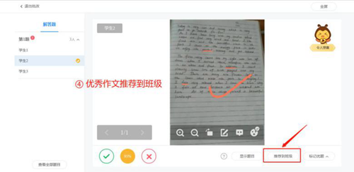 查看學生的作答,并進行批改,可將優秀答案推薦到班級,讓學生之間互評互賞。