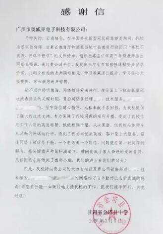 圖為酒泉市教育發(fā)展服務(wù)中心給予奧威亞的感謝信